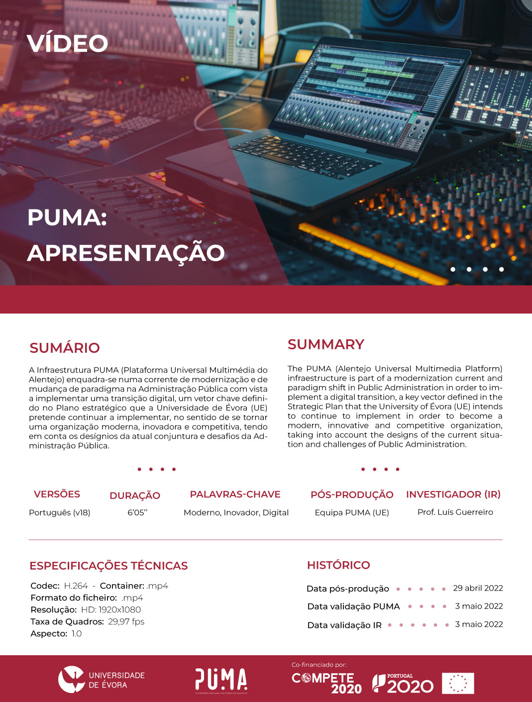 The PUMA (Alentejo Universal Multimedia Platform) infraestructure is part of a modernization current and paradigm shift in Public Administration in order to implement a digital transition, a key vector defined in the Strategic Plan that the University of Évora (UE) intends to continue to implement in order to become a modern, innovative and competitive organization, taking into account the designs of the current situation and challenges of Public Administration.