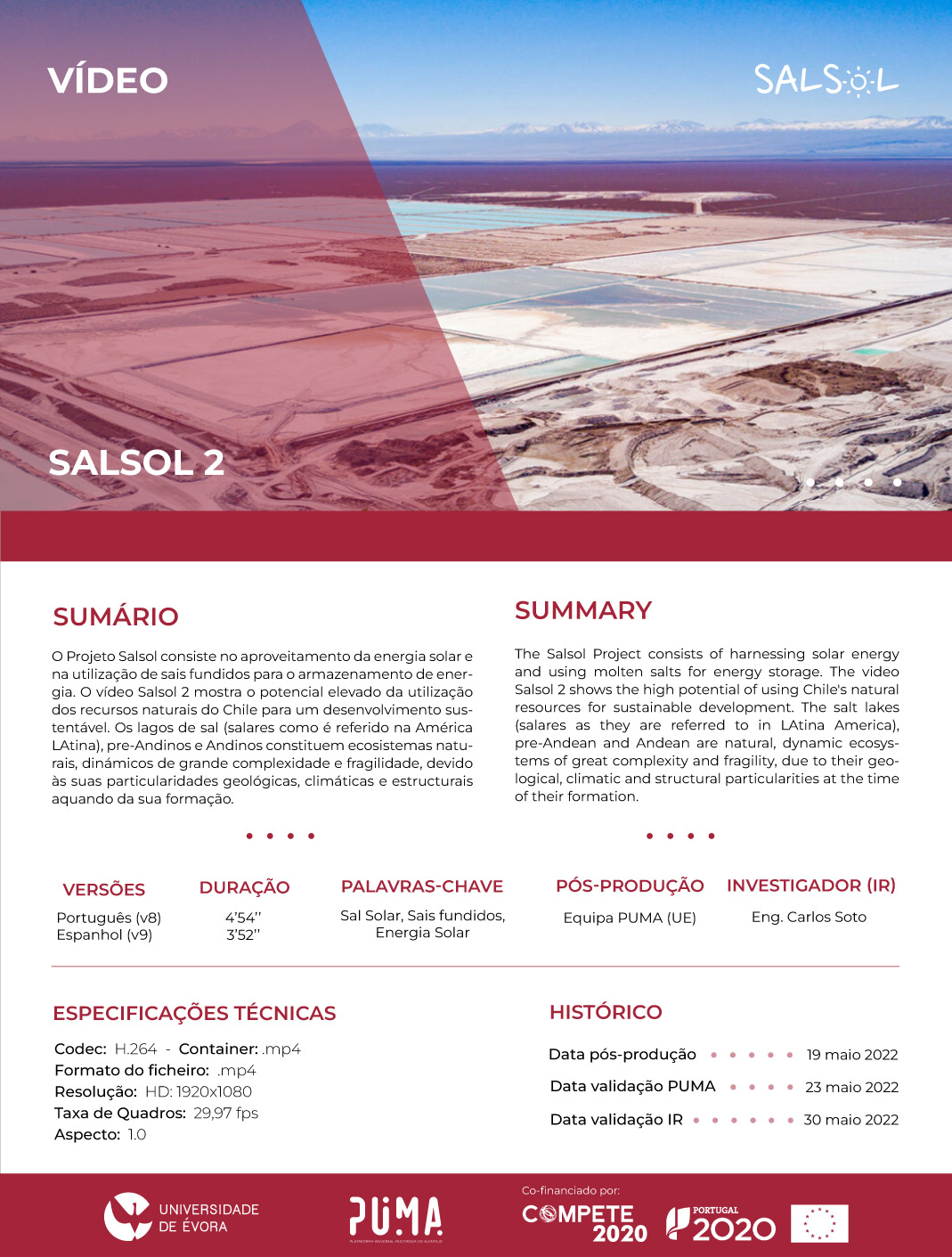 O Projeto Salsol consiste no aproveitamento da energia solar e na utilização de sais fundidos para o armazenamento de energia. O vídeo Salsol 2 mostra o potencial elevado da utilização dos recursos naturais do Chile para um desenvolvimento sustentável. Os lagos de sal (salares como é referido na América LAtina), pre-Andinos e Andinos constituem ecosistemas naturais, dinámicos de grande complexidade e fragilidade, devido às suas particularidades geológicas, climáticas e estructurais aquando da sua formação.